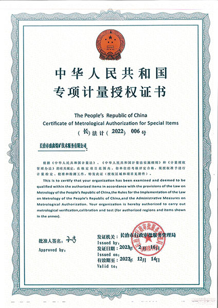 • 專項計量授權(quán)證書